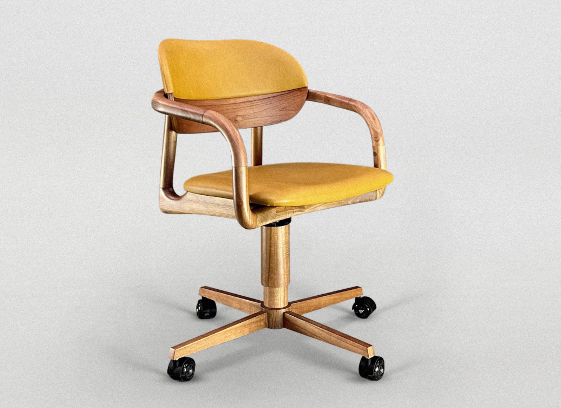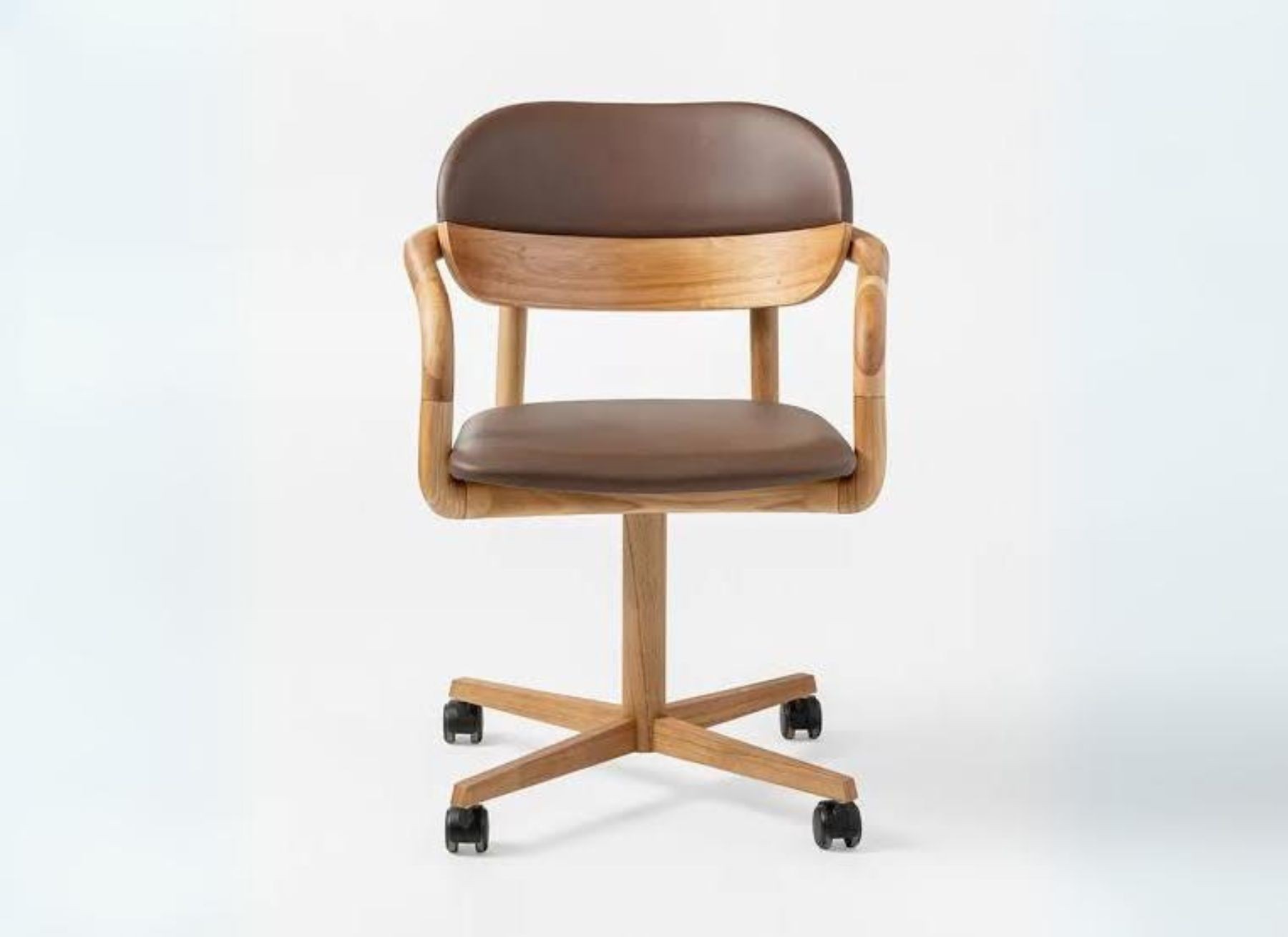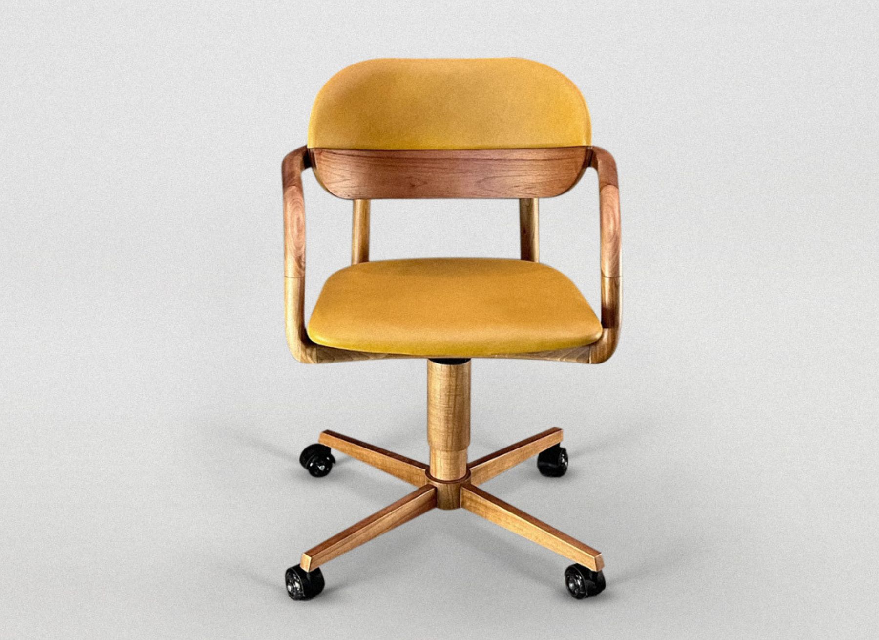 Madeira maciça. Assento e encosto estofados. Giratória com rodízios e regulagem de altura.