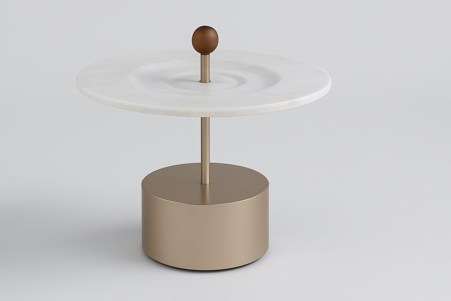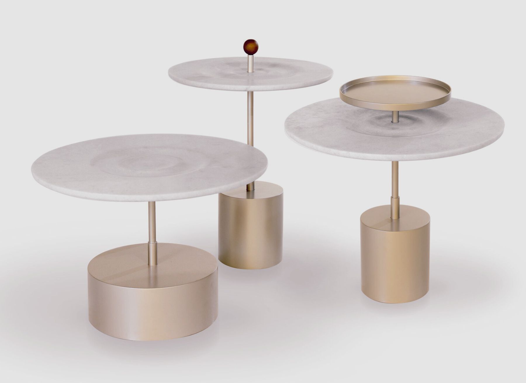 As mesas laterais Marola, de Edu Bortolai para a coleção Refúgio 2025, trazem o desenho da ondulação natural da água do mar no tampo de pedra natural.
