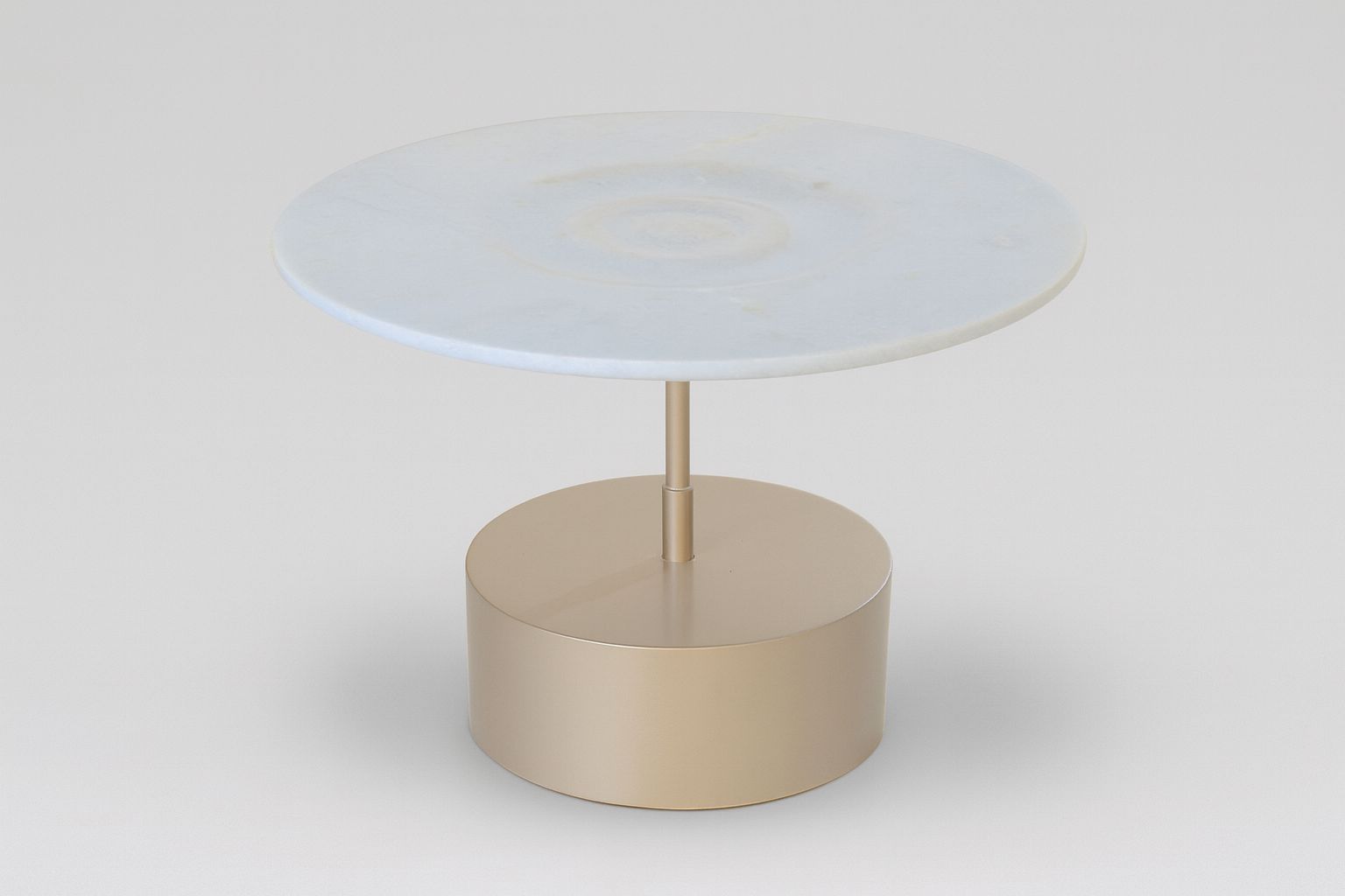 Base e haste em metal. Tampo em mármore usinado. Detalhe em madeira.