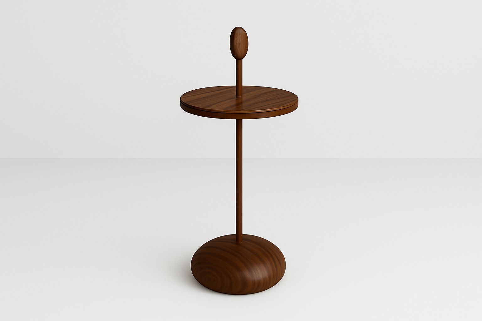 No árido solo nordestino, onde pedras se empilham como um mar de calhaus, nasce o conceito de uma mesa de apoio. Esguia e elegante, sua base de madeira em forma orgânica evoca os contornos dos calhaus do agreste. Uma haste esbelta se ergue, conduzindo ao tampo sinuoso de madeira, cujas curvas delicadas exaltam sua matéria-prima. Assim, a peça transcende, unindo robustez e graciosidade em cada linha traçada.